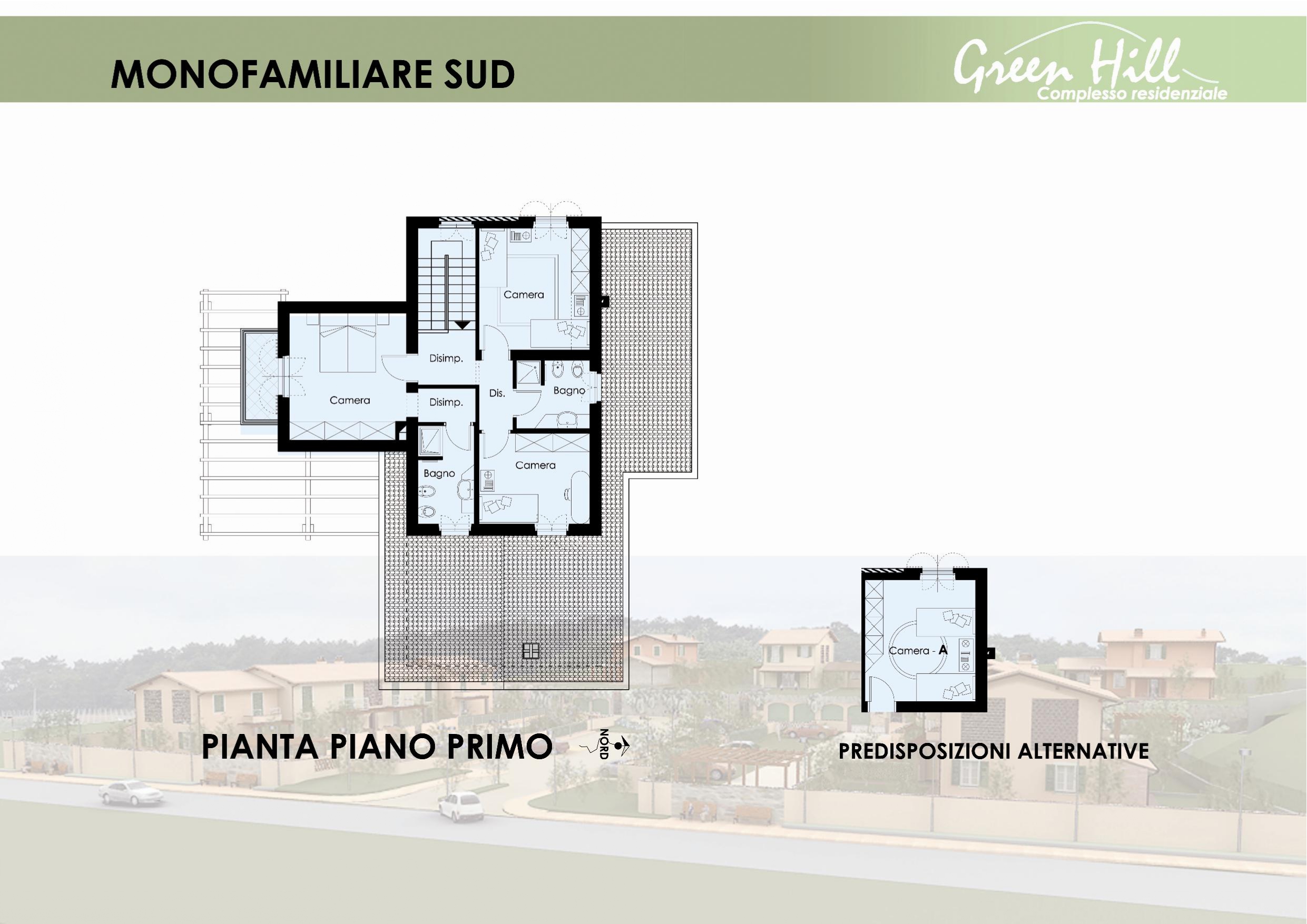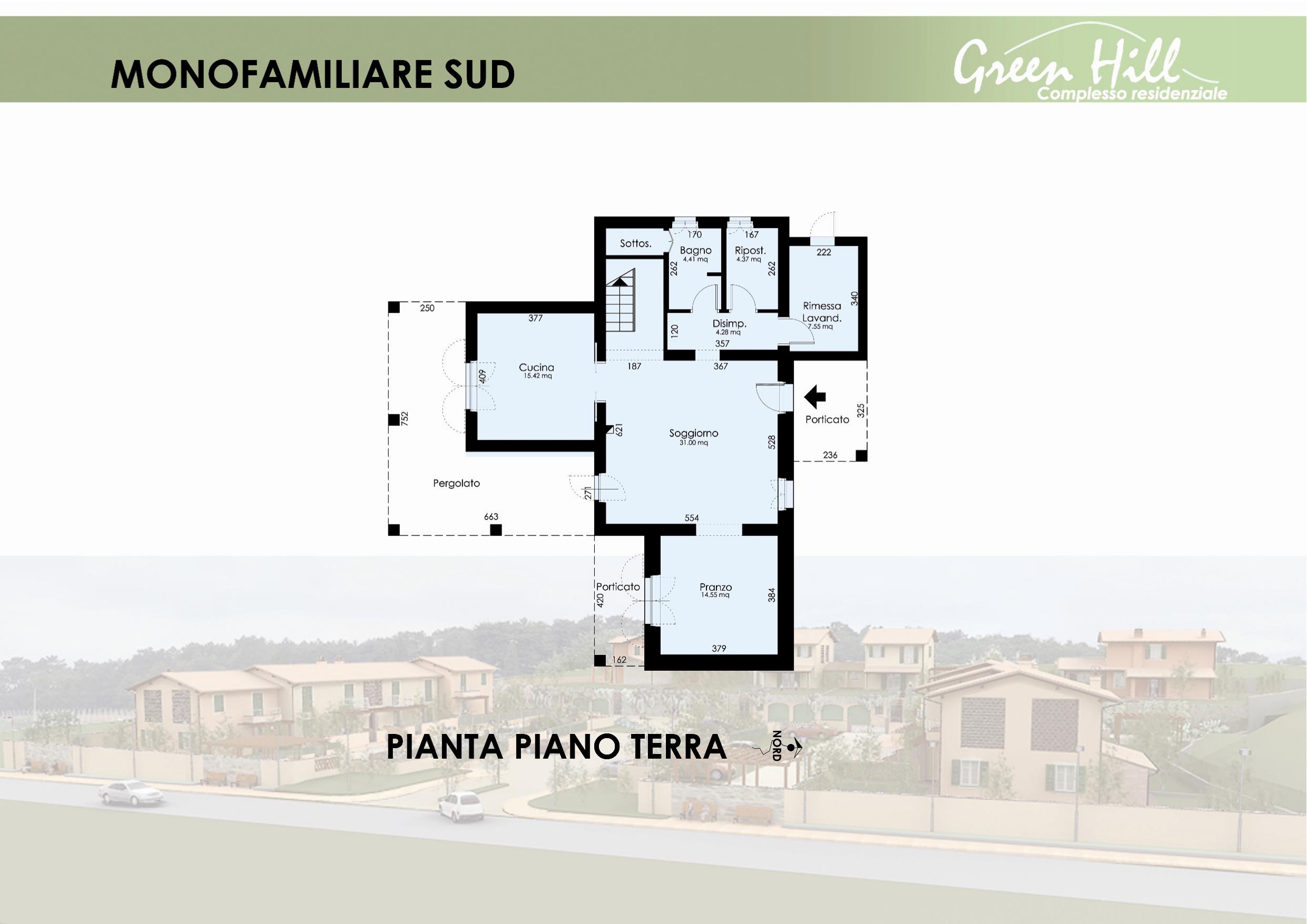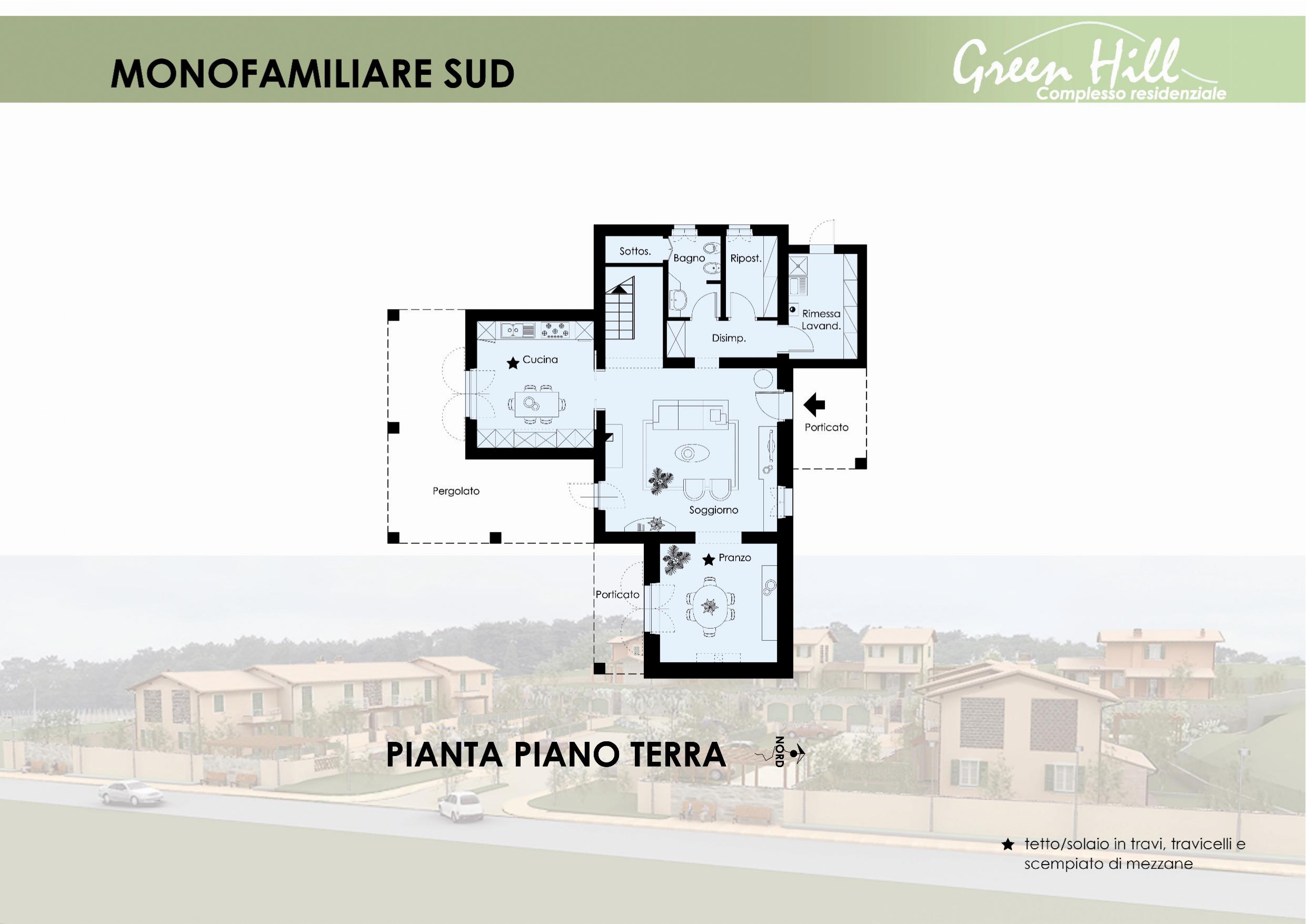 Finiture : Portoncini d’ingresso blindati, gres porcellanato nella zona giorno e parquet nella zona notte, ceramica nei bagni, aria condizionata a mezzo split, termosingoli, infissi in legno, impianto di allarme, videocitofono ed antenna tv.
