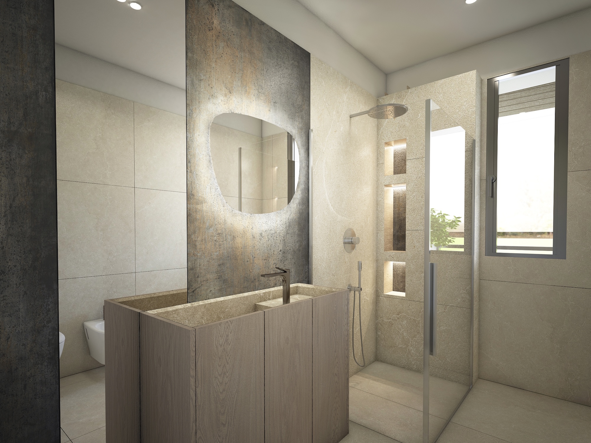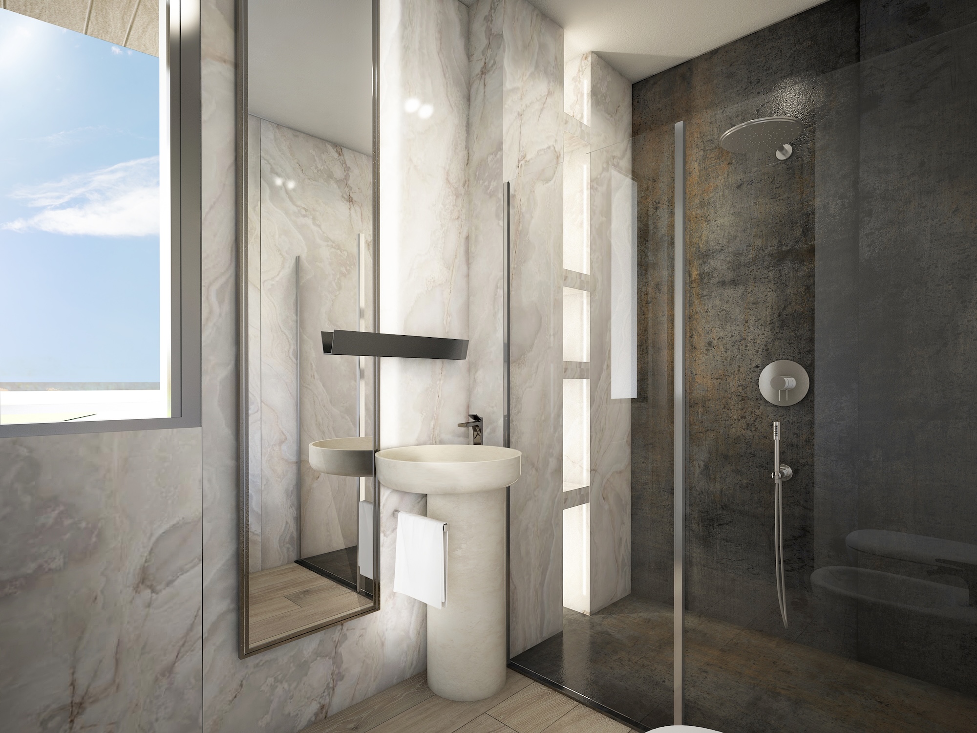 Appartamento posto al primo piano, libero su tre lati che si affaccia sul bellissimo ed ampio balcone di circa 60 mq così composto: ingresso su ampio soggiorno, cucina e zona pranzo, ripostiglio, disimpegno, camera da letto matrimoniale con cabina armadi e bagno privati, camera da letto singola, bagno.